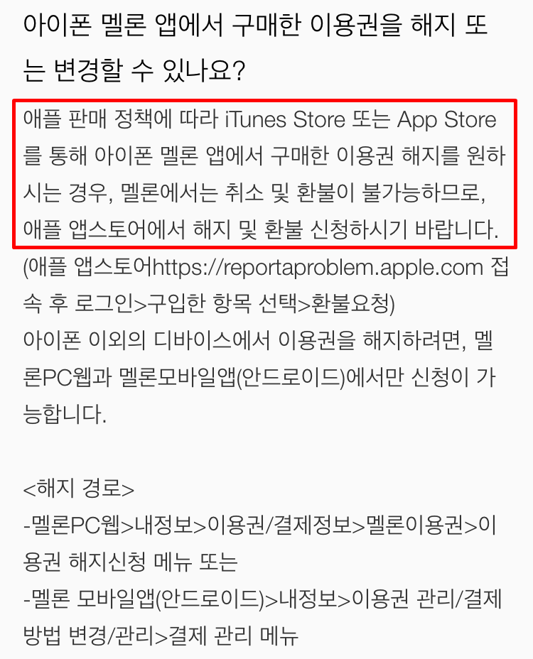 해지해야지 생각만 하고 그냥 지냈는데 또 다음달이 되어 멜론 이용액이 또 결제가 되어 그제서야 다시 멜론 사이트로 들어가 해지를 찾아 보았는데요. 아이폰은 멜론 앱에서 이용권 해지를 할 수가 없다고 나오더라구요. 애플 정책이 그렇게 되어 있어서 멜론에서는 해지를 못한다고 해서 약간 번거롭고 귀찮은 마음이 들던데요. 그래도 돈이 걸린 일이라 잘 찾아보았어요.
