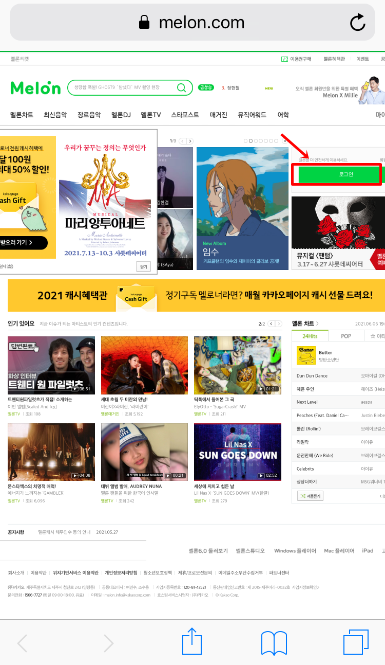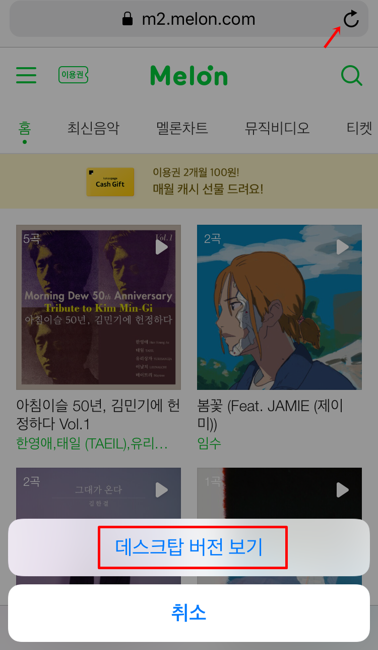 멜론 사이트로 들어가서 데스크탑 버전으로 변환해야 하는데요. 최신 아이폰은 왼쪽에 한한 글씨를 누르면 된다고 하던데 저는 최신폰이 아니라 오른쪽 끝에 있는 새로고침 표시를 꾹 눌러주면 되었어요. 아래 데스크탑 버전 보기를 누르시면 됩니다.
