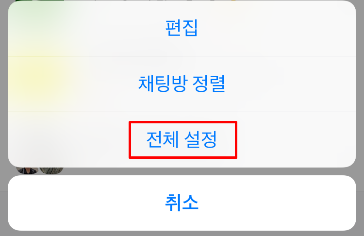 점 세개 메뉴를 누르면 작은 창이 아래 쪽에 보이게 되는데요. 그 중 전체 설정을 눌러요.
