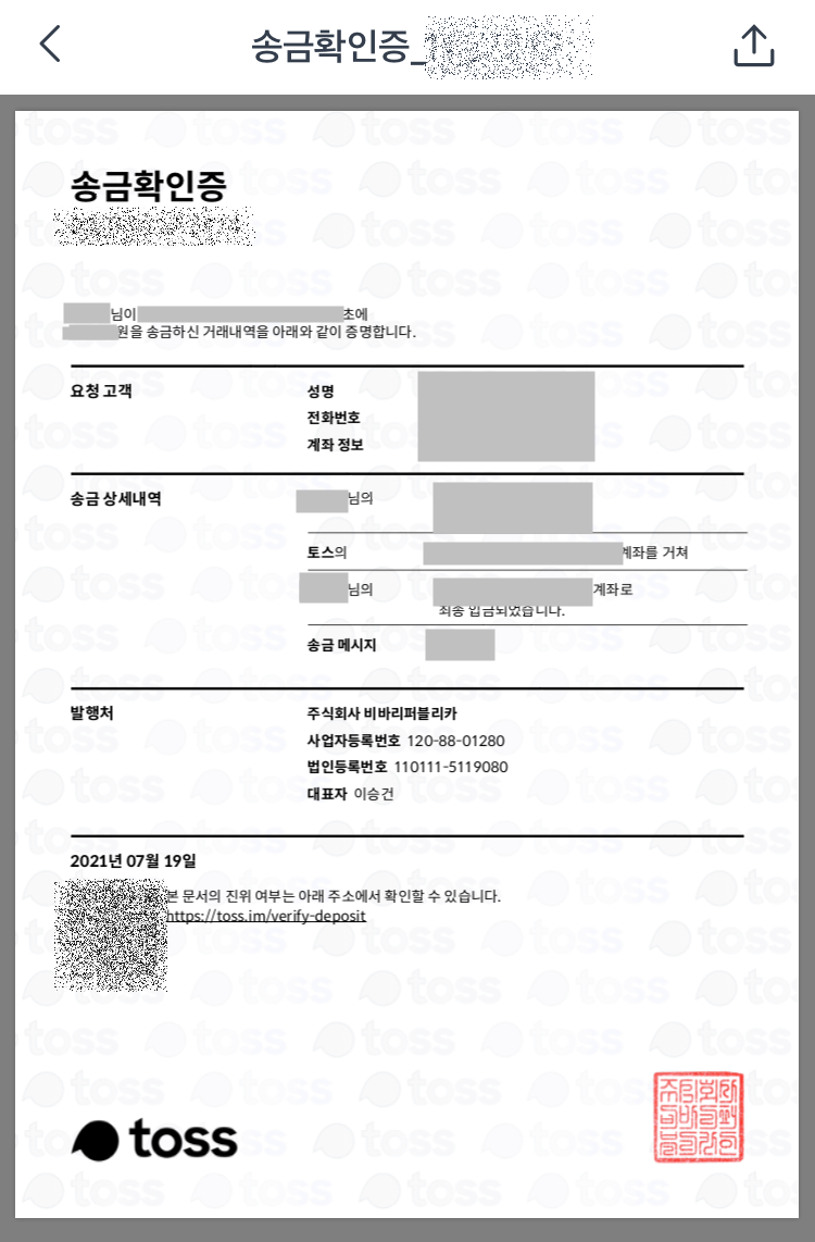 토스 이체확인증