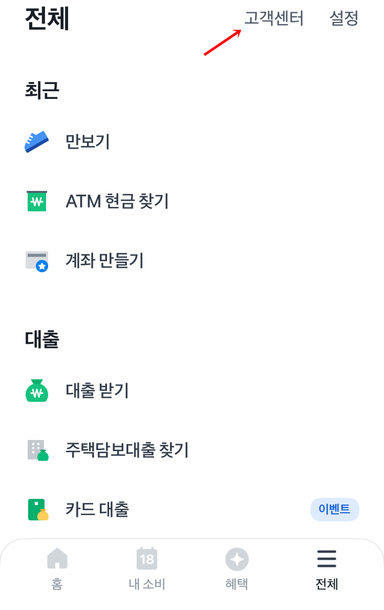 전체메뉴로 들어가면 오른쪽 윗부분에 고객센터 메뉴가 있어요. 고객센터를 누르면 바로 이체확인증을 발급받을 수 있는 화면이 보여요.