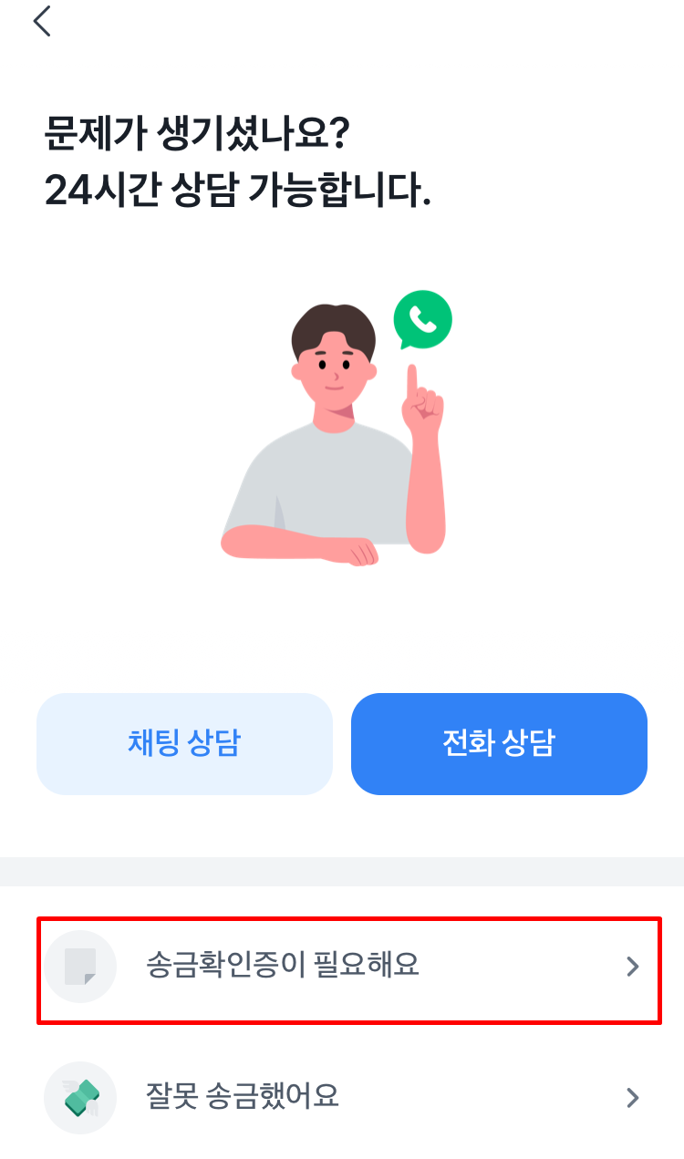 고객센터로 들어가니 채팅상담과 전화상담이 가능하다는 안내가 나오구요. 문제가 생긴 경우 24시간 상담이 가능하다고 되어 있는데 24시간 언제나 상담이 가능한 점은 정말 편리한 것 같아요. 상담 안내 아래쪽에 자주 요청하는 메뉴들이 바로 보이게 되는데요. "송금확인증이 필요해요" 로 들어가서 발급받을 수 있어요.
