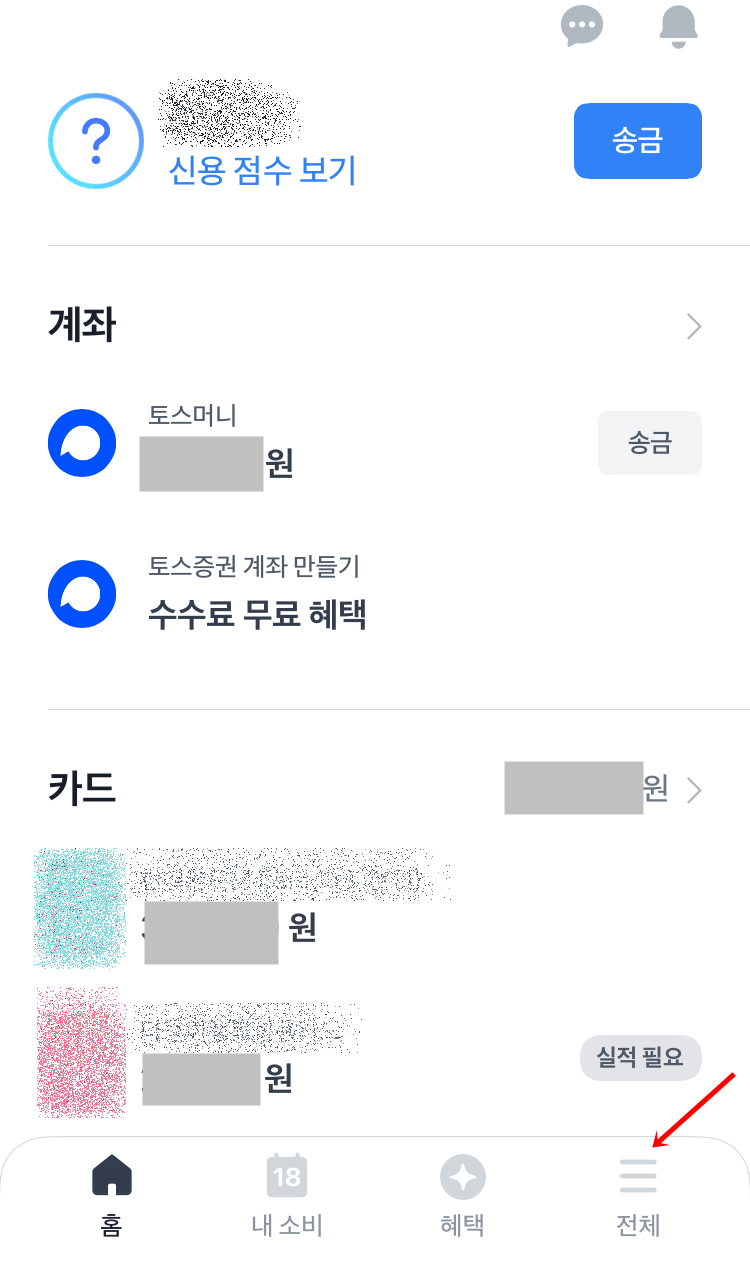 토스 화면 제일 아래쪽에 긴세줄 모양의 전체메뉴 버튼을 눌러서 고객센터로 들어갈 수 있어요.