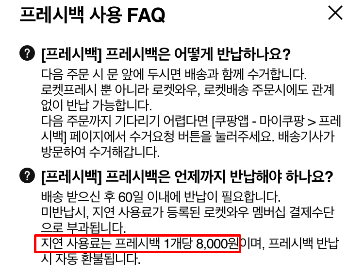 하지만 쿠팡 프레시백 반납 기간이 60일로 정해져 있고, 60일이 지나면 지연 사용료를 내게 되어 있더라구요. 지연 사용료는 프레시백 1개당 8000원이네요. 미 반납시 지연사용료가 로켓와우 멤버십 결제수단으로 부과가 된다고 해요.