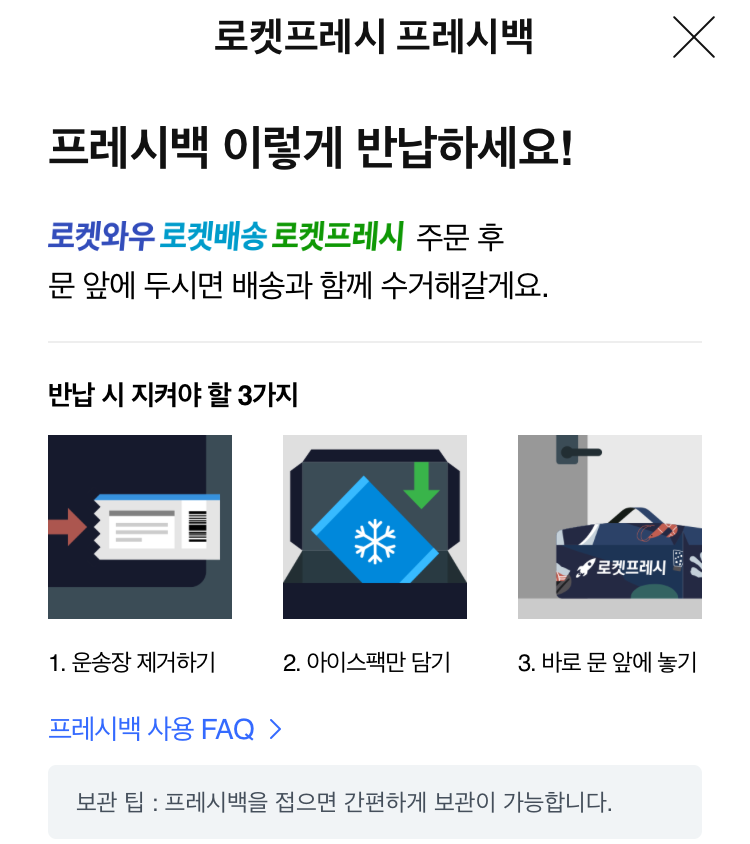 쿠팡 프레시백 반납은 주문 후 문 앞에 두면 되는데요. 개인정보 보호를 위해 운송장은 제거한 다음에 내 놓아야 하구요. 아이스백은 그대로 담아 반납을 하면 되고 바로 문앞에 두라고 되어 있어요.