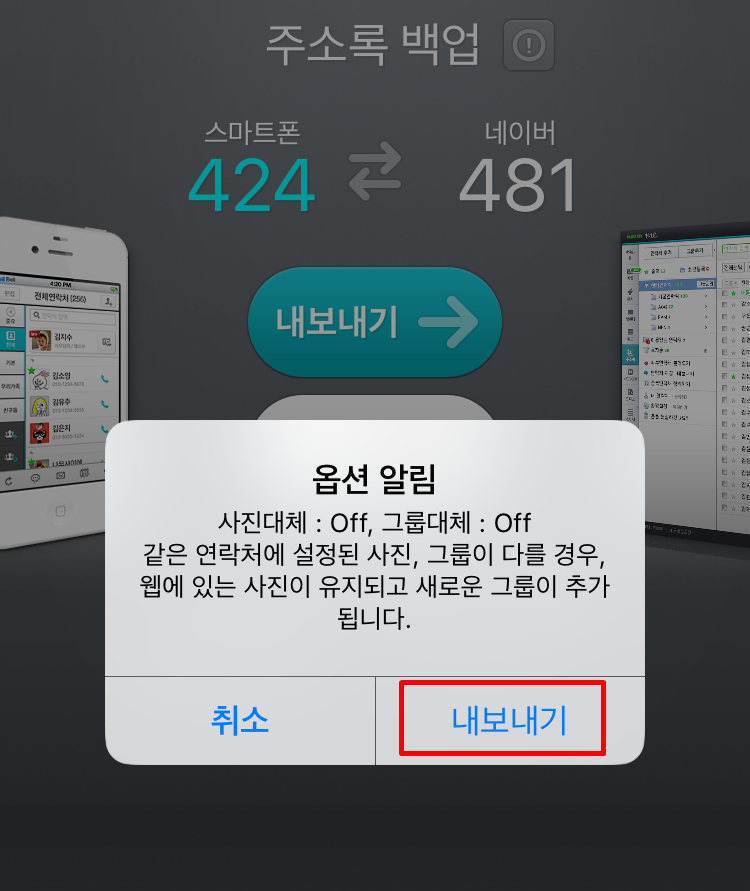 내보내기를 누르면 스마트폰에서 네이버로 주소록이 옮겨지는 것이고, 가져오기는 네이버의 주소록을 내 휴대폰으로 불러들이는 기능이예요. 두 가지 기능으로 휴대폰의 전화번호를 네이버 주소록에 저장해 두었다가 필요할 때 다시 받아서 사용할 수 있구요. 내보내기 버튼을 누르면 옵션 알림 창이 뜨고 내보내기 버튼을 누르면 휴대폰 연락처가 네이버 주소록으로 저장되기 시작해요.