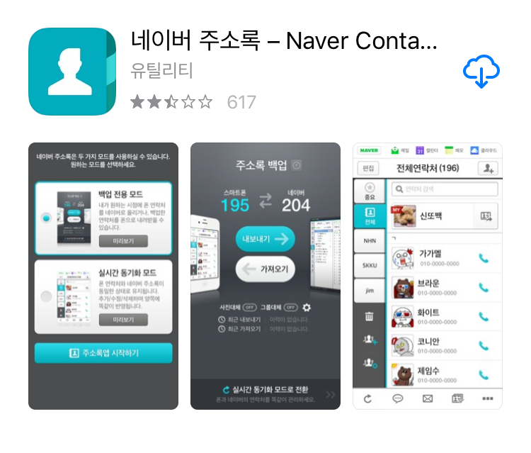 스마트폰 전화번호를 네이버 주소록과 연동하여 백업을 하려면 먼저 네이버 주소록 앱이 필요해요. 앱스토어나 구글 플레이스토어에서 네이버 주소록을 검색하여 설치를 해 주어야 하네요.