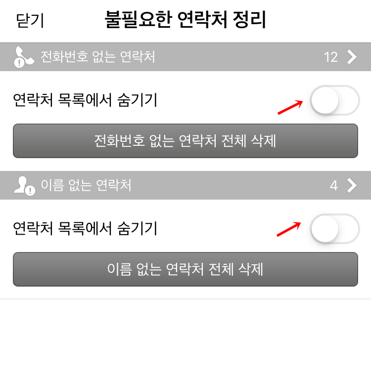 불필요한 연락처 정리를 할 수 있는데요. 전화번호 없는 연락처를 숨기기 혹은 삭제를 할 수 있고, 이름없는 연락처를 목록에서 숨기기 하거나 삭체를 할 수 있어요.