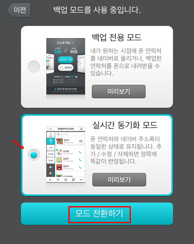 네이버 주소록은 두 가지 모드가 있는데요. 간단하게 사용할 수 있는 백업 전용 모드와 여러 기능이 있는 실시간 동기화 모드가 있어요. 저처럼 휴대폰 고장이나 분실에 대비해서 연락처를 백업해 놓을 용도로 사용할 경우에는 백업 전용 모드가 간단하게 사용하기 편하구요. 연락처를 실시간으로 동기화 하고 주소록을 편집 관리하려면 실시간 동기화 모드가 편리한 것 같아요.