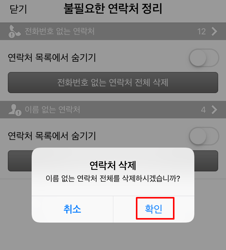이름 없는 연락처는 무슨 번호인지 기억도 안 날 것 같고 해서 지워버리기로 하고 연락처 전체 삭제를 눌렀더니 깔끔하게 삭제가 되었네요.