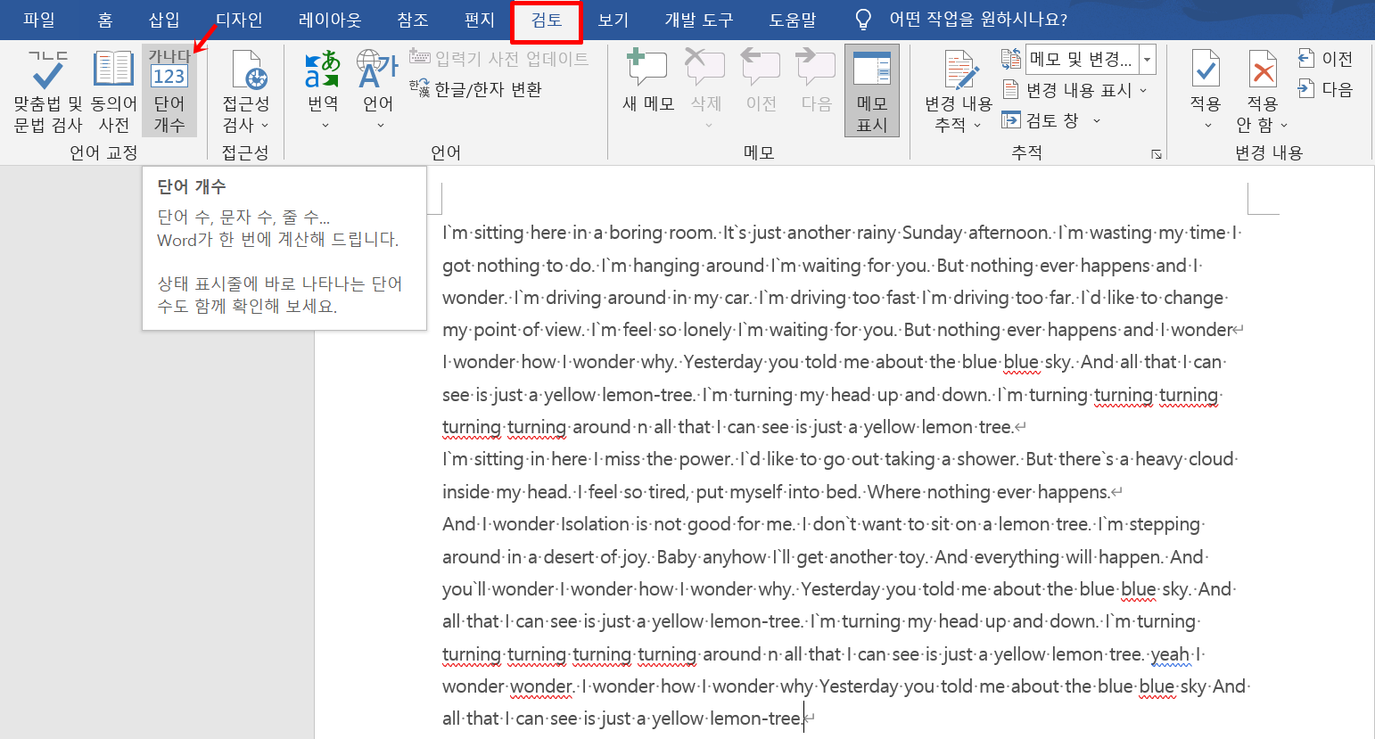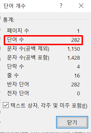 검토에서 단어 개수를 누르면 영어 단어수 세기 결과가 바로 나오는데요. 제가 작성한 영어 문장의 단어 수는 282개로 나오네요. 문자 수도 확인할 수 있는데 문자 수는 공백 제외와 공백 포함 두 가지 모두 확인할 수 있어요.