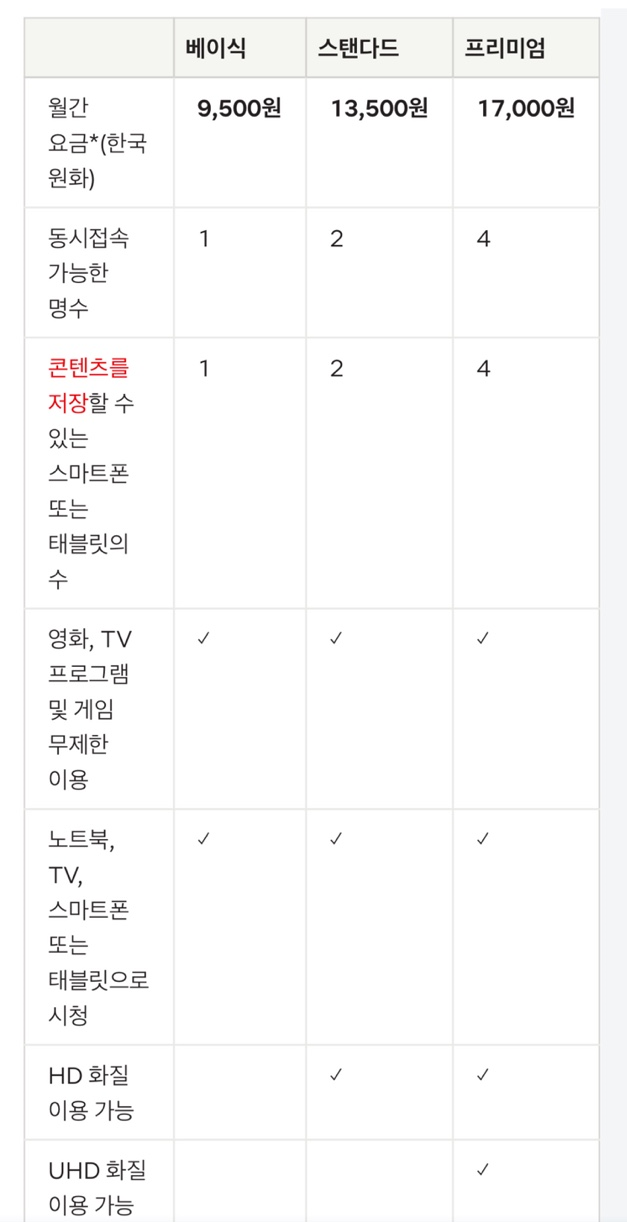 넷플릭스 멤버십에 따라 요금과 동시접속 인원, 화질등이 달라지는데요. 베이식 요금제는 월 9500원으로 동시접속은 1명, 콘텐츠 저장도 한명, 화질은 HD와 UHD는 이용할 수 없게 되어 있구요. 스탠다드 요금제는 월 13500원이고 동시접속은 2명, 콘텐츠 저장도 두명, 화질은 HD까지 가능해요. 프리미엄 요금제는 월 17000원이고 동시접속은 4명까지 가능하니 한 명 요금제는 4250원 꼴이라 4명 모두 사용한다면 알뜰하게 이용할 수 있는 요금제라고 할 수 있고, 또 화질도 UHD까지 가능한 요금제입니다.