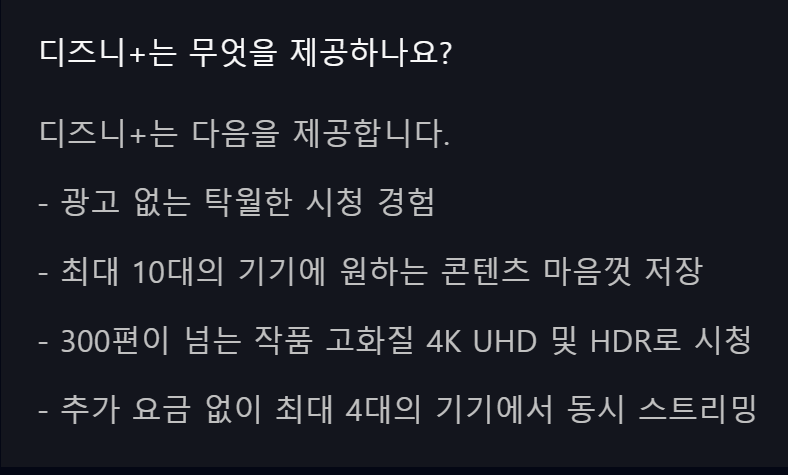 디즈니플러스는 요금제가 하나라서 동시접속 숫자도 요금제와 상관없이 고정이 되어 있는데요. 추가 요금 없이 최대 4대의 기기에서 동시 스트리밍이 가능하다고 해요.