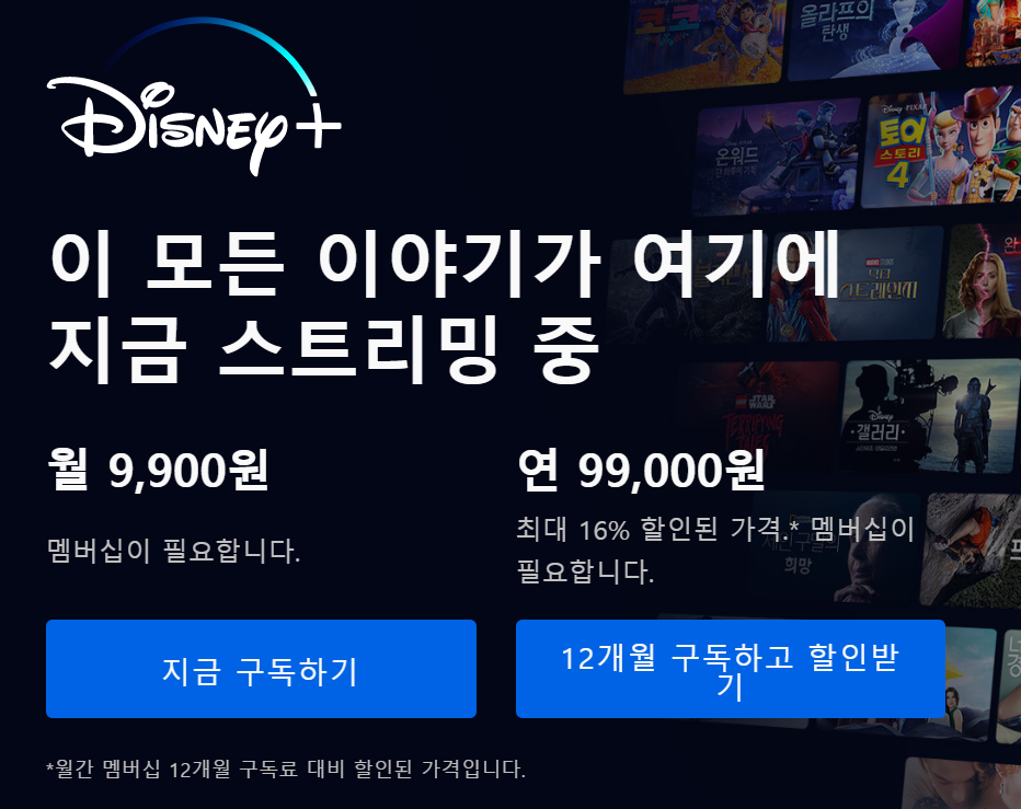 디즈니 플러스 가격은 한 달에 9900원으로 넷플릭스 베이식 요금제인 월 9500원과 비슷한 수준인데요. 연회원으로 가입을 하면 열 달 가격인 99000원으로 일 년 12개월을 이용할 수 있어 2달 요금을 할인받을 수 있다고 해요. 계산을 하면 9900원 X 12개월 = 118800원인데 99000원에 이용할 수 있어 16% 할인을 받는 것으로 나오네요. 2달 요금을 한꺼번에 99000원을 내는 것은 좀 부담스럽기도 하고, 내가 보고 싶은 컨텐츠가 얼마나 있을지 모르는 상황에서 연 회원은 가입하는 것은 생각을 좀 해봐야 하는 문제인 것 같아 보이네요.