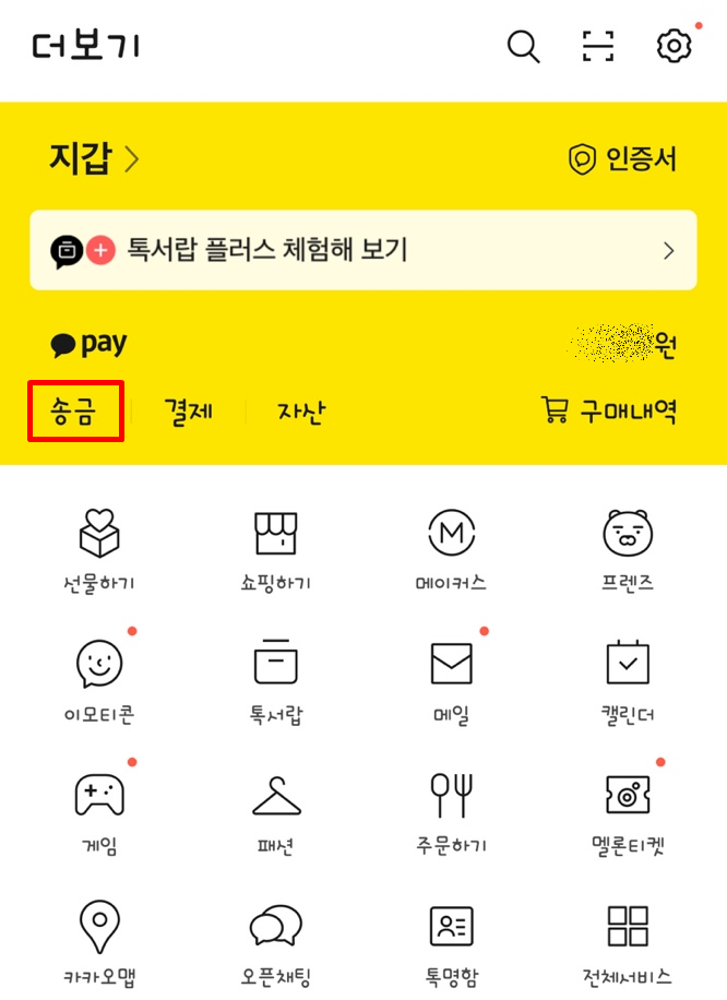 카카오페이 송금은 카카오톡으로 들어가서 맨 아래 점 세개 모양의 더보기 메뉴를 누르면 중간에 송금 메뉴가 있어요.