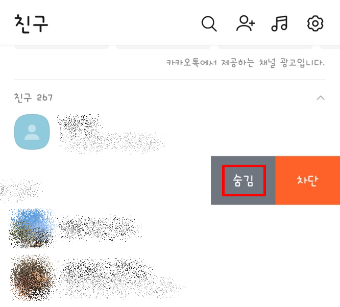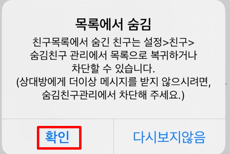 숨김과 차단 중에서 숨김 버튼을 눌러요.