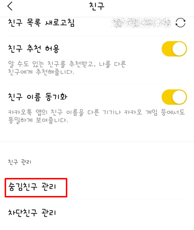 친구 관리 버튼을 누르면 친구관련 다양한 메뉴들이 보이는데요. 친구 관리 아래에 숨김친구 관리 메뉴가 있어요.
