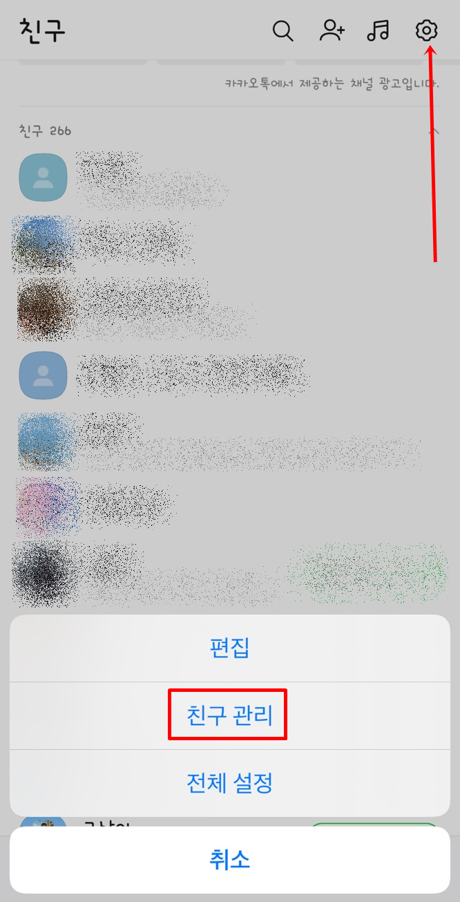 친구목록이 복잡해서 숨겨 놓았지만 다시 카카오톡을 보낼 일이 많이 생기면 숨김을 취소하는 것이 편한데요. 친구 탭에 들어가서 맨 위에 있는 톱니바퀴 모양의 설정 버튼을 누르면 친구관리 메뉴가 나타나요.