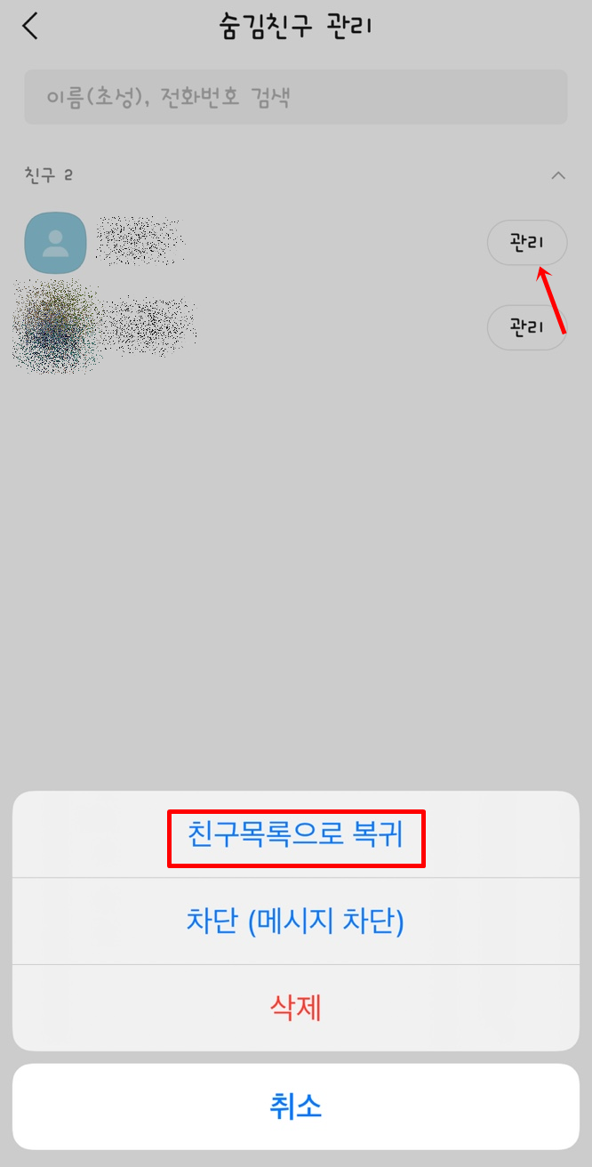 숨김친구 관리를 누르면 숨김처리한 친구들의 목록이 보이는데요. 숨김 취소를 할 친구 옆에 있는 관리 버튼을 누르고 친구목록으로 복귀를 누르면 다시 친구 목록에 숨김처리한 친구의 이름이 나타나게 되어요.