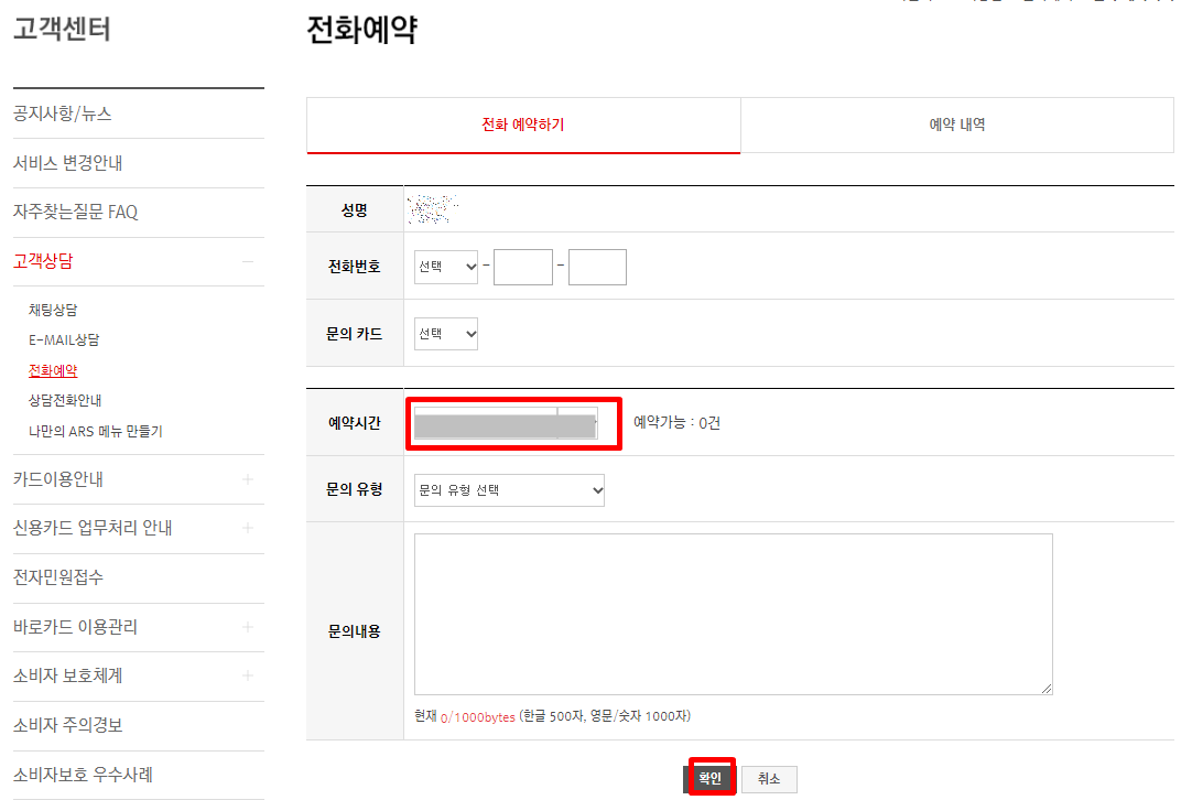 전화예약 버튼을 누르면 로그인 페이지가 나오는데 로그인을 하게 되면 전화예약 신청화면이 보여요. 전화번호와 예약시간, 문의 유형과 내용을 입력하면 비씨카드 고객센터에서 전화를 하여 답변을 해주는 형태인 것 같아요.