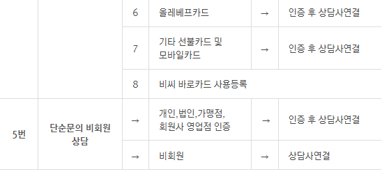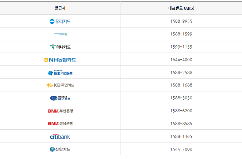 카드 선결제와 결제일변경, 결제계좌변경, 카드신청, 카드해지, 카드론 등은 카드를 발급받은 은행이나 카드사로 문의해야 한다고 해요. 카드 발급사별 대표번호 참고해 주세요.