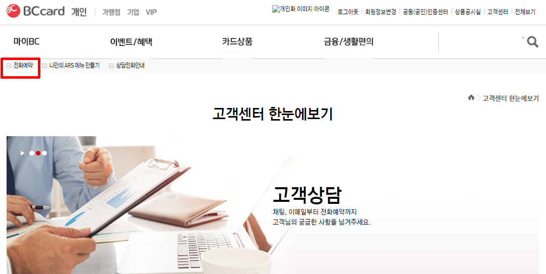 그런데 요즘 전화 상담원 숫자가 줄어서인지 전화 통화해서 상담원 연결하기가 굉장히 어려운 것 같아요. 상담원 연결하기 위해 대기시간이 30분 이상 걸렸다는 이야기도 들었는데요. 전화 통화 기다리기 어려울 경우 비씨카드 홈페이지에서 상담전화를 예약할 수 있는 서비스가 있더라구요. 비씨카드 홈페이지에 들어가서 로그인을 한 다음, 전화예약을 해야 하는데요. 저는 비씨카드 홈페이지에 가입한지 오래 되었어서 비밀번호를 잊어버려서 비밀번호 찾기를 한 다음에 예약신청을 했어요. 전화예약을 하려면 비씨카드 홈페이지에 들어가서 오른쪽 위에 있는 고객센터로 들어가면 되어요.