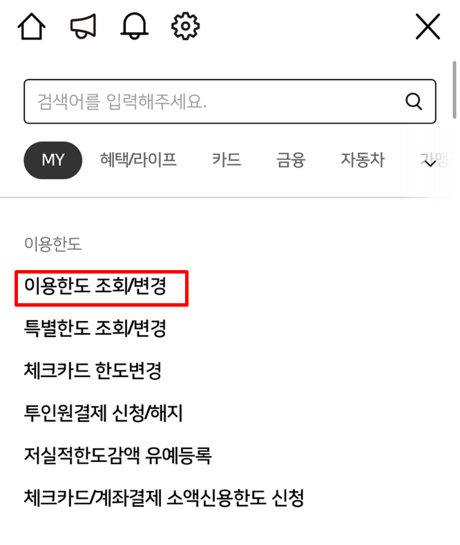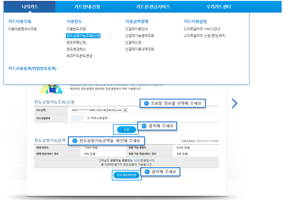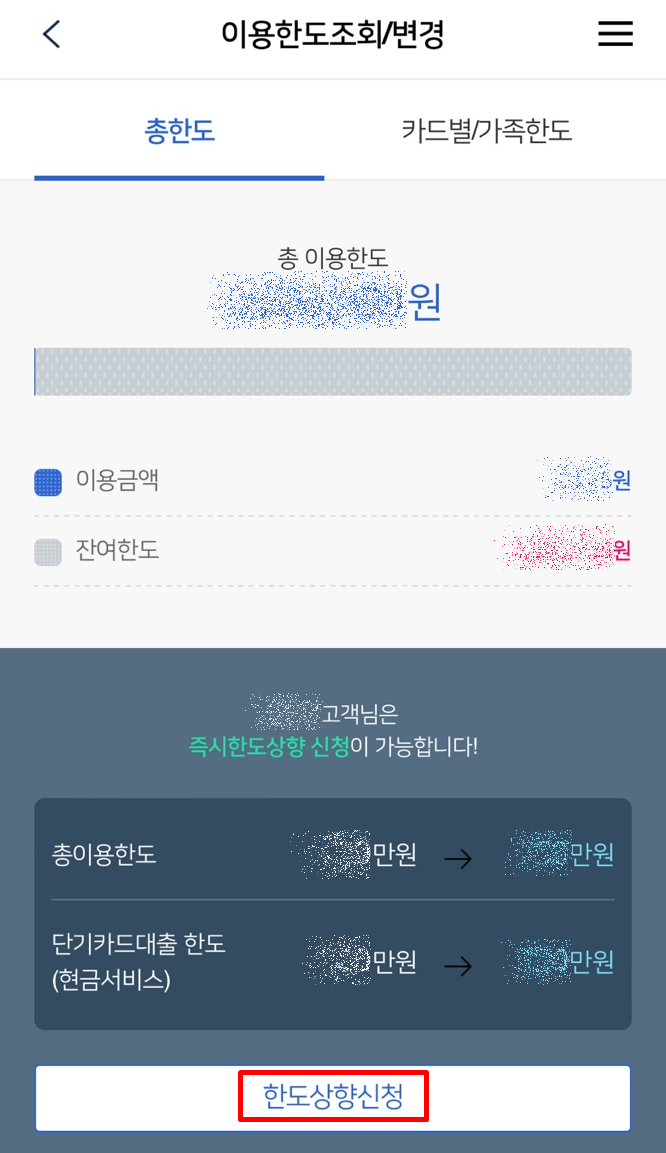나의카드 > 이용한도 > 한도상향가능조회/신청