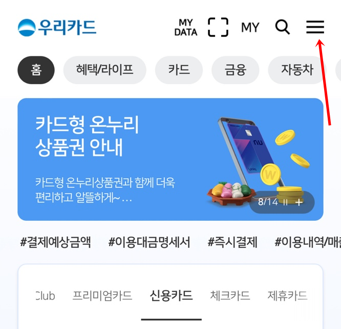 우리카드 앱에서 한도조회/상향신청은 스마트폰 우리카드 앱에서 확인과 신청을 할 수 있는데요. 우리카드 앱을 열어서 줄 세개 모양의 전체메뉴 버튼을 눌러요.