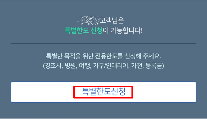 한도상향신청을 한 후에도 추가로 한도를 증액해야 할 경우 특별한도신청을 할 수 있는데요. 특별한 목적을 위해 전용한도를 신청할 수 있게 되어 있어요. 특별한도 신청은 한 가지 사유로 신청을 해야 하는데, 경조사, 병원, 여행, 가구/인테리어, 가전, 등록금 중 하나를 선택하여 특별한도신청을 할 수 있네요.