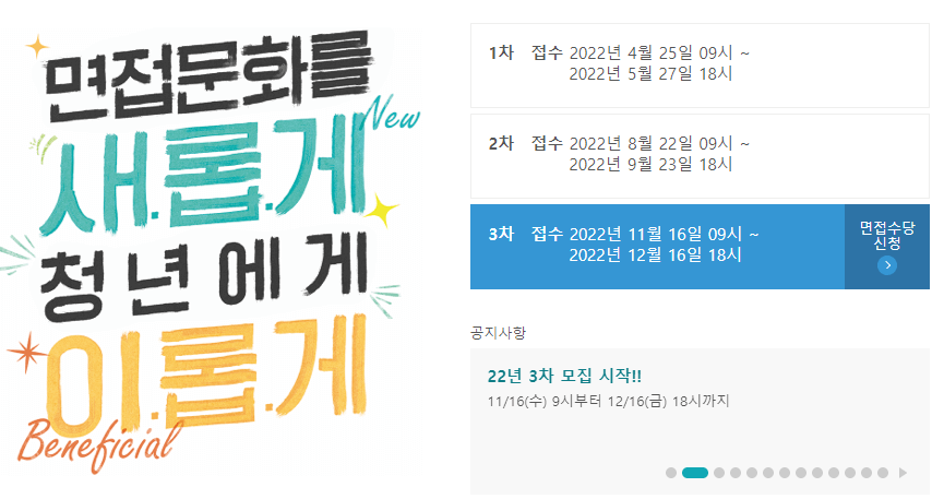 현재 경기도 청년 면접수당은 3차 신청을 접수 받고 있습니다. 신청기간은 2022년 11월 16일부터 12월 16일 18시까지이니 신청기간 내에 신청하세요.